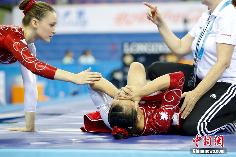 10月5日,第45届世界体操锦标赛女子资格赛在广西南宁开赛,加拿大选手YU Aleeza在平衡木的比赛中受伤。 中新社发 盛佳鹏 摄