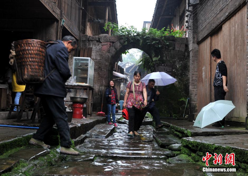 10月4日,国庆长假第四天,龙华小镇迎来小批量游客,青石板的街道上不停地有游客行走的踪影。四川屏山县龙华镇始建于宋代,是历代四川边防驻军重地。小镇依山而建,房屋错落有致,街道全由青石板铺成,全木质结构的街坊至今保存完好。据悉,小镇没有开发成为旅游景点,老屋里还住着不少人家。 中新社发 刘忠俊 摄