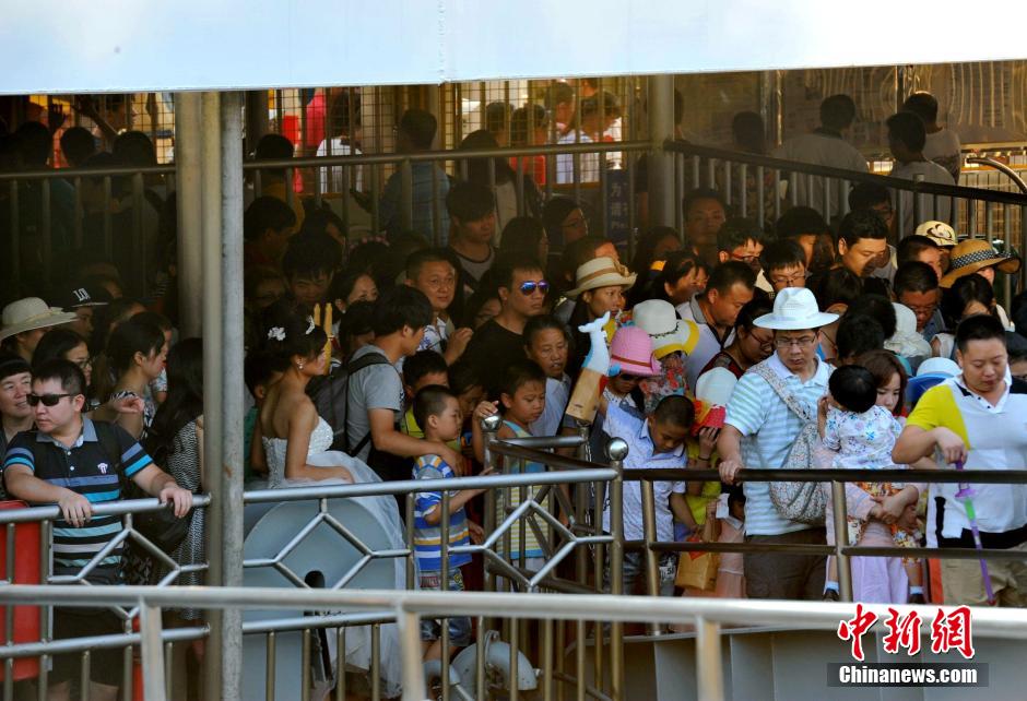 10月4日,傍晚大批的游客陆续出岛。根据《鼓浪屿游客承载量测算与流量管控方案》,鼓浪屿景区瞬时最大承载量核定为3万人次,日最大承载量核定为6.5万人次,日最佳承载量核定为3万人次。据厦门市旅游局发布的数据显示,当日鼓浪屿接待8万人,占核定日最大接待量的296%,远超鼓浪屿“日最大承载量”,堪称“严重超载”。 中新社发 张斌 摄