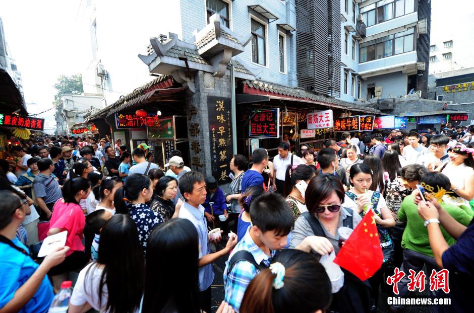 10月5日,武汉户部巷小吃街不到200米长的小巷内,挤满了前来大饱口福的市民和游人。 中新社发 张畅 摄