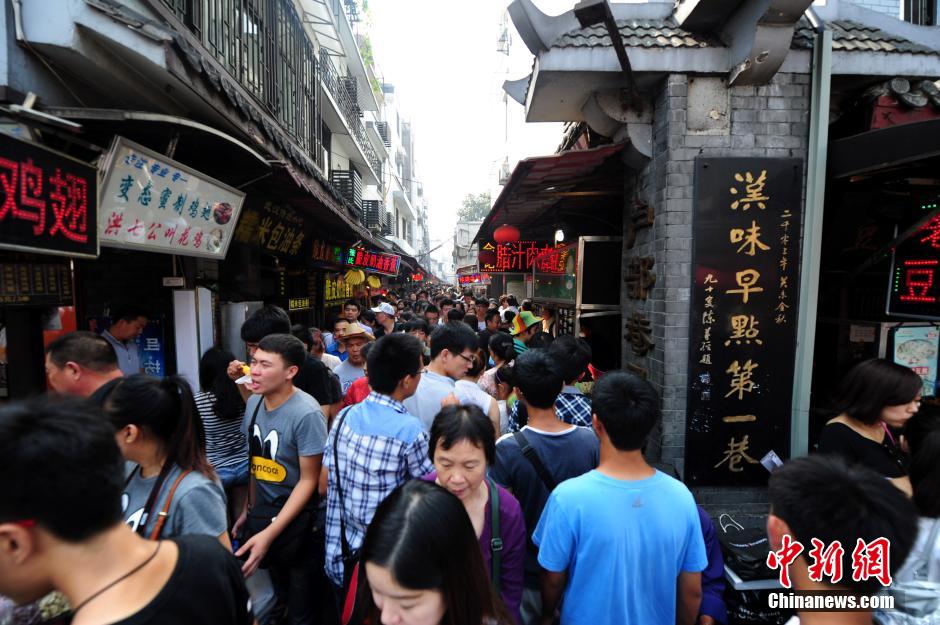 10月5日,武汉户部巷小吃街不到200米长的小巷内,挤满了前来大饱口福的市民和游人。 中新社发 张畅 摄
