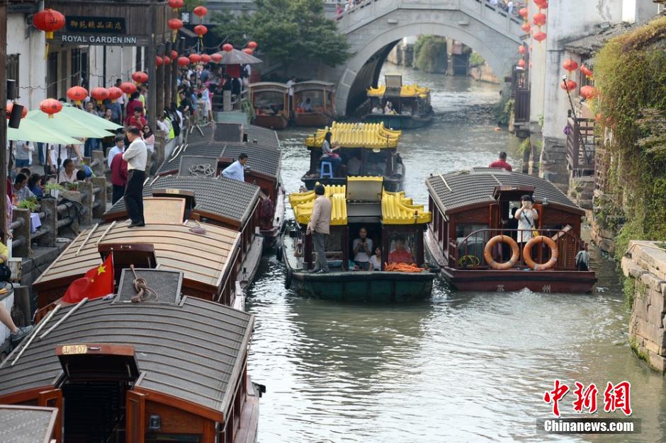 10月5日,大批市民和游客涌入苏州山塘老街游玩。当日是国庆假期的第五天,虽然假期过半即将结束,一些热门旅游城市的热门景点依旧游客不减。王思哲 摄