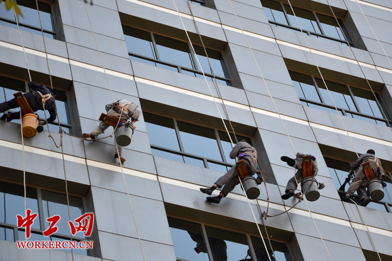 10月6日,在人们还沉浸在“十一”黄金周的节日氛围中的时候,北京某建筑大楼上的一群高空“蜘蛛侠”们已经上岗工作了。他们悬吊在十几米高的玻璃幕墙上边擦玻璃、边随风晃动,令人不由得替他们捏一把冷汗。 (中工网记者 笑语摄)