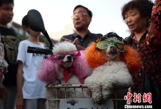10月5日,两只戴着眼镜和帽子、染着“发型”扎着领结,打扮的花枝招展的狗狗在主人的带领下走上南京街头,可爱的模样吸引了众多路人的围观。