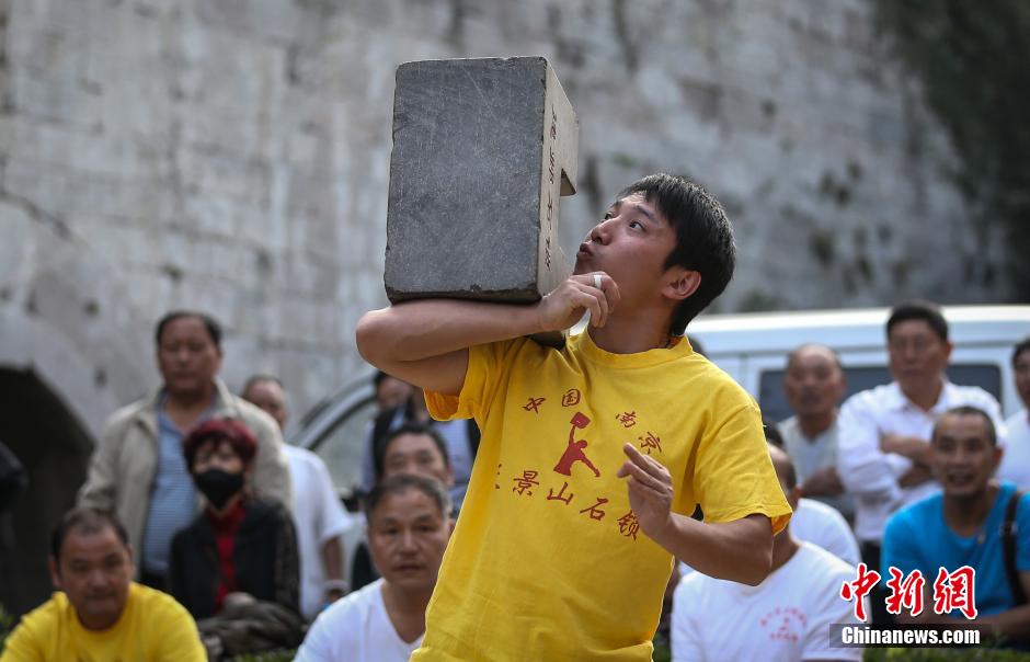 10月6日,一群民间大力士齐聚南京,在中华门城堡内轮番上场,抛、接、举起数十斤至一百多斤不等的石锁,展示力量与技巧。石锁起源于中国古代军营,士兵常用于锻炼身体,后流传于民间,演变为一项集力量、技巧、健身于一体的传统竞技项目。 中新社发 泱波 摄