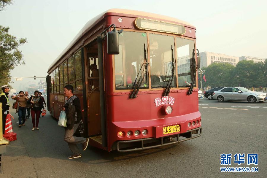 10月7日,游客乘坐“铛铛车”在天安门东站下车。北京首开的12辆仿古观光“铛铛车”自9月28日上路以来,吸引了众多游客和市民争先体验,国庆黄金周期间更是人员满座。北京仿古观光“铛铛车”从永定门城楼出发,行经天坛、老北京天桥演艺区、前门商业老字号聚集区和天安门广场、故宫博物院、景山公园等20处著名景点。新华社发(陈晓根 摄)