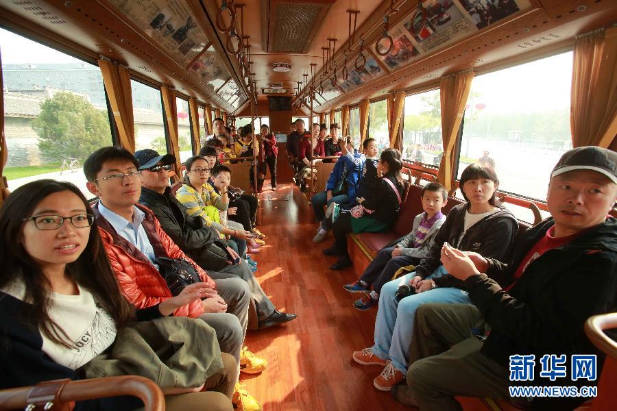 10月7日,游客乘坐“铛铛车”沿途观光浏览。北京首开的12辆仿古观光“铛铛车”自9月28日上路以来,吸引了众多游客和市民争先体验,国庆黄金周期间更是人员满座。北京仿古观光“铛铛车”从永定门城楼出发,行经天坛、老北京天桥演艺区、前门商业老字号聚集区和天安门广场、故宫博物院、景山公园等20处著名景点。新华社发(陈晓根 摄)