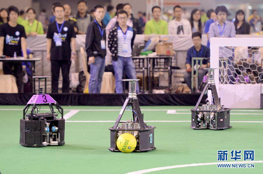 10月10日,在2014中国机器人大赛现场,机器人在进行足球比赛。当日,为期3天的2014中国机器人大赛在安徽合肥正式开赛。来自南京大学、清华大学等国内众多高校的2000余名选手将在足球机器人、救援机器人、家庭机器人等多个项目上进行比赛和展示。新华社记者 郭晨 摄