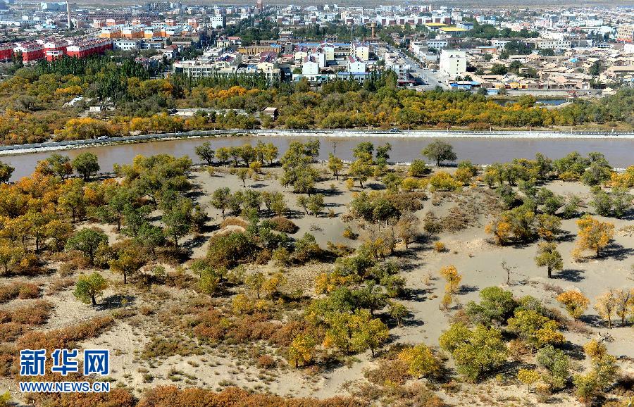 这是黑河水滋养下的额济纳绿洲中的胡杨林和额济纳旗政府所在地达来呼布镇(10月9日摄)。内蒙古额济纳旗位于内蒙古最西端,在黑河水浇灌下的额济纳绿洲,历史上曾是水草丰美之地。20世纪60年代后,由于黑河中上游人口增长,灌溉用水大增,使下游水量持续减少,加上不合理的人为活动及超载放牧,致使额济纳境内河道断流加剧,居延海完全干涸,额济纳绿洲急剧萎缩,植被大面积退化,荒漠化加速蔓延,沙尘暴等自然灾害频发。 2000年,国务院决定实施黑河水量统一调度,向额济纳绿洲和居延海集中输水,使干旱多年的额济纳绿洲得到有效灌溉,地下水位明显回升,部分濒临死亡的胡杨以及消失多年的甘草和芦苇等植物又开始复苏,曾经的沙尘源额济纳重新焕发出勃勃生机。截至目前,额济纳旗林业用地面积已达2029.18万亩,全旗林地比2001年增加了495.83万亩。 新华社记者任军川摄