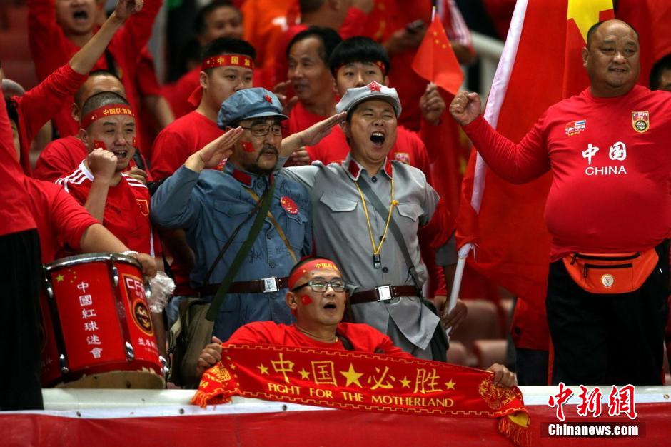 10月10日,2014足球友谊赛在武汉举行,中国男足3-0战胜非主力出战的泰国队,报了去年1-5惨败的一箭之仇。图为看台上的球迷大声助阵。图片来源:Osports全体育图片社
