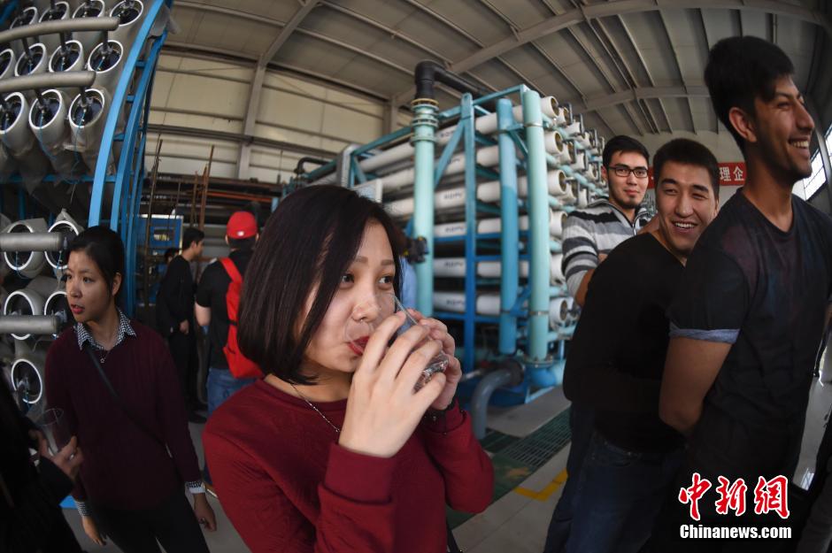 10月17日,北京燕山石化水净化回用装置区,留学生试饮污水净化成品。当日,中央财经大学国际文化交流学院的33名留学生来到北京燕山石化,参加燕山石化举办的公众开放日活动。留学生们以了解国有大型石化企业的环境保护及发展现状,作为大三本科生的实践活动课题。位于北京房山的燕山石化公司隶属于中国石化集团,成立于1970年,是中国建厂最早、规模最大的现代石油化工联合企业之一。 中新社发 廖攀 摄