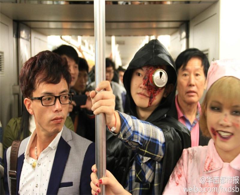 10月16日下午,骷髅恶魔、死灵法师、疤面护士等恐怖鬼怪惊现成都地铁站。短短几分钟内,“妖魔鬼怪”们惊悚怪诞的造型吸引了大批市民前来围观,纷纷拿出手机拍照合影。据悉,此次地铁站口的“闹鬼”行动,是为即将开幕的成都欢乐谷第六届万圣欢乐节造势。图片来源:华西都市报官方微博