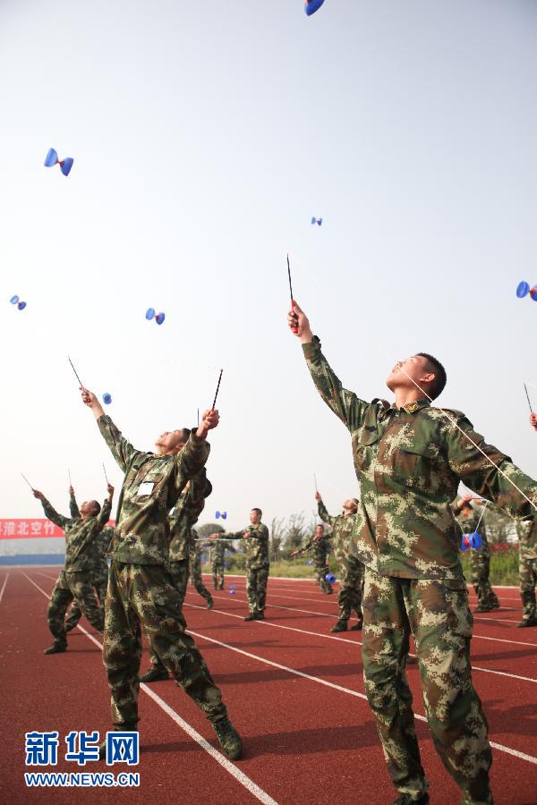 10月18日,武警淮北市支队新战士在体验抖空竹技巧。当日,安徽省淮北市柿元空竹协会走进武警淮北市支队新训中队,向广大新战友传授抖空竹技巧,并赠送了一批空竹给新训中队,以丰富新战友的文化生活。新华社发(蔡啸天 摄)