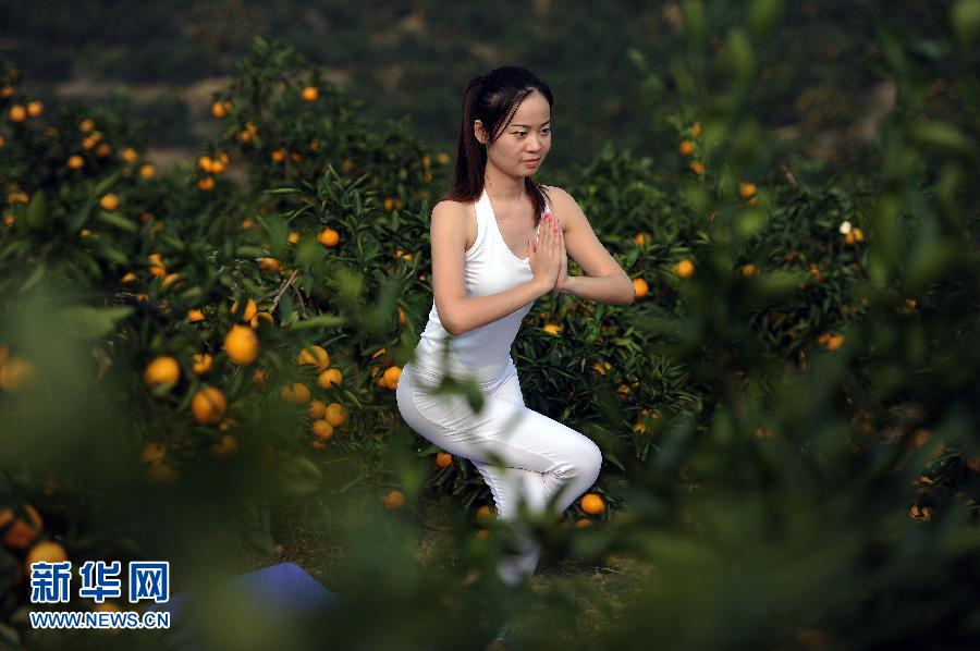 10月18日,一位瑜伽教练在橘园里表演瑜伽。当日,在位于雪峰山脚下的湖南洞口县山门镇的橘园里,来自湖南三鑫瑜伽教练培训学院的30位瑜伽教练在橘园中上演了一场瑜伽秀。新华社记者李尕摄