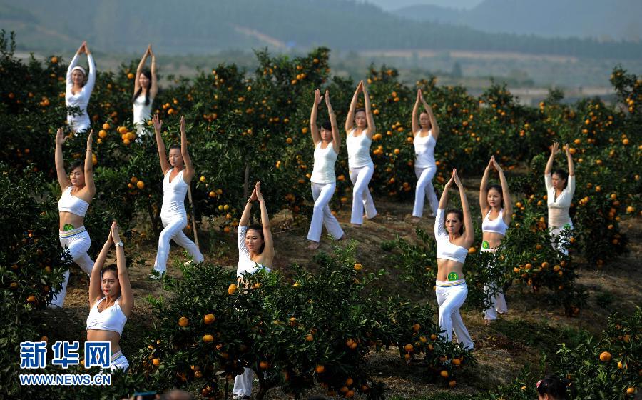 10月18日,瑜伽教练们在橘园里表演瑜伽。当日,在位于雪峰山脚下的湖南洞口县山门镇的橘园里,来自湖南三鑫瑜伽教练培训学院的30位瑜伽教练在橘园中上演了一场瑜伽秀。新华社记者李尕摄