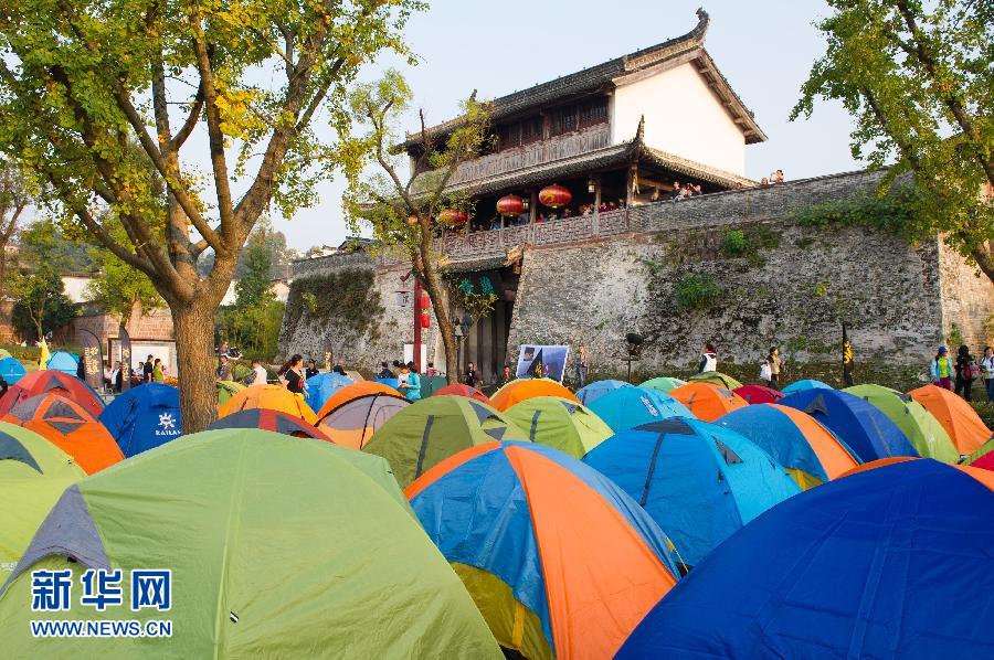 10月18日,徽州古城下搭起了各种颜色的帐篷。当日,徽州古城第一届帐篷节在古徽州府衙所在地安徽歙县举行,来自全国的1000余名驴友在徽州古城墙下搭起各色帐篷,形成一道亮丽的风景线。新华社记者 杜宇 摄
