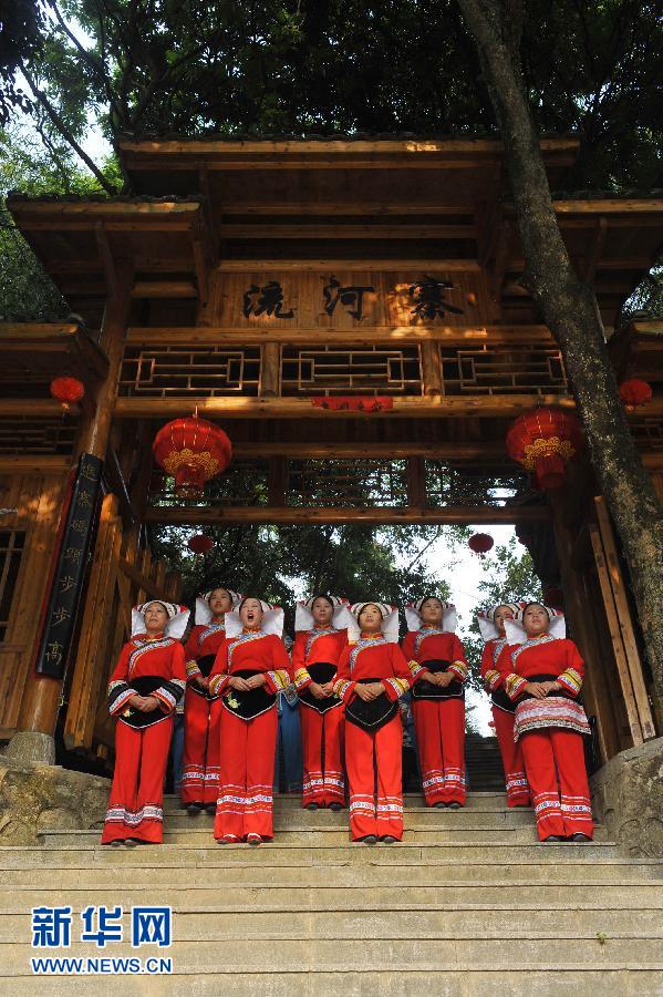 10月18日,工作人员在广西宜州市流河寨景点唱山歌欢迎游客。广西宜州是壮族“歌仙”刘三姐的故乡。近年来,宜州市以“建设循环经济强市,打造宜居旅游名城”为发展战略,努力推进旅游业跨越发展。2014年1月1日至10月15日,该市共接待国内外游客201.71万人次,同比增长37.64%;旅游总收入达16.62亿元,同比增长38.21%。新华社记者鲁鹏摄
