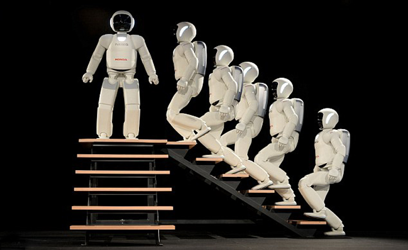 本田的人形机器人在英国伦敦有线会议上展示爬楼梯技能。