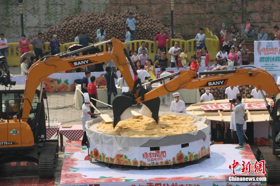 10月18日,长沙世界之窗内,经长沙市开福区公证处公证,直径4米、厚6.5厘米、重达1863斤的超级南瓜饼在现场制作出锅。资料显示,之前最大南瓜饼吉尼斯纪录保持的成绩是直径3.75米,680公斤。 刘双双 摄