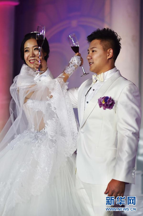 10月18日,陈一冰(右)与单竞缇在结婚典礼上。当日,中国体操名将、奥运冠军陈一冰与单竞缇在天津举行结婚典礼。婚礼现场以天津和伦敦两座城市为主题,陈一冰出生于天津,妻子单竞缇在伦敦从事同声传译工作,两人在两座城市经过不断奔波后,终于走进了婚姻殿堂。新华社发