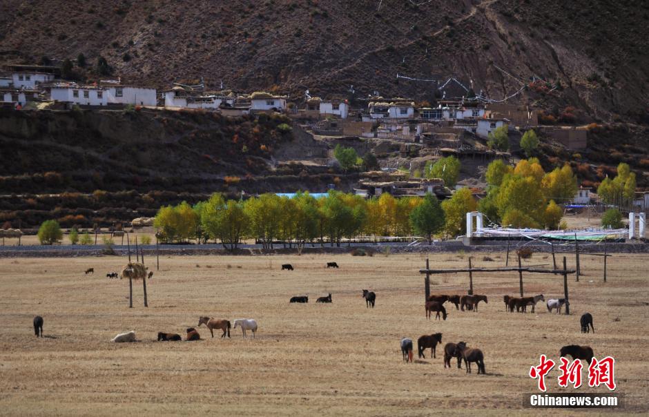 10月中旬以来,国道318川藏线西藏昌都地区境内,迎来一年中最美的季节,藏房、河流、雪山、金色的树林构成一幅幅美丽的画卷,让人流连忘返。图为西藏昌都国道318川藏线路边的秋色。中新社发 刘忠俊 摄