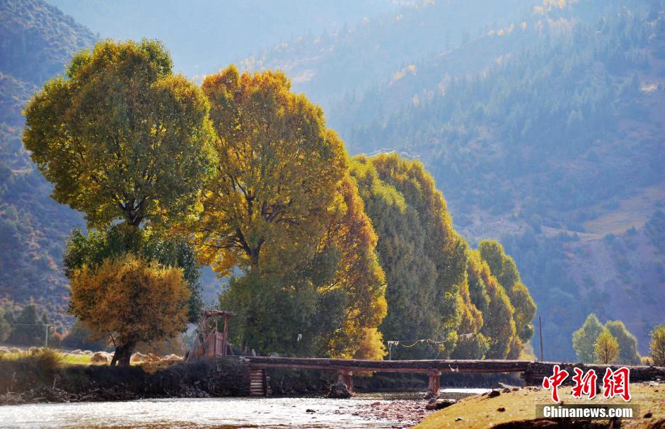 10月中旬以来,国道318川藏线西藏芒康县境内,迎来一年中最美的季节,藏房、河流、金色的树林构成一幅幅美丽的画卷,让人流连忘返。图为芒康秋色。中新社发 刘忠俊 摄