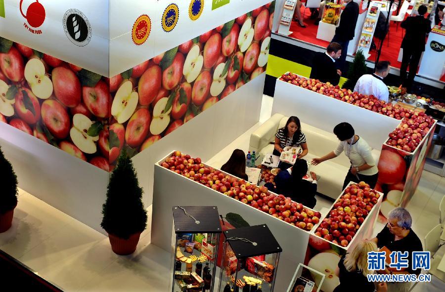 10月19日,人们在法国巴黎的2014巴黎国际食品展上参观。当日,为期五天的2014巴黎国际食品展在位于北郊的维勒班展览中心拉开帷幕,来自世界各地6000多家展商参展。展品包括水果、蔬菜、海鲜、调味品、奶制品、甜品、酒类、饮料、食品加工机械等。新华社记者陈晓伟摄