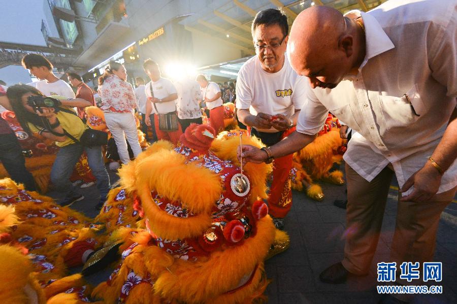 10月19日,在马来西亚吉隆坡,一名嘉宾在为一个狮头点睛。当日,为配合由马来西亚龙狮麒麟总会主办的舞狮文化大汇演“百狮盛会”,三百狮头点睛仪式在马来西亚吉隆坡举行。 新华社发(张纹综摄)