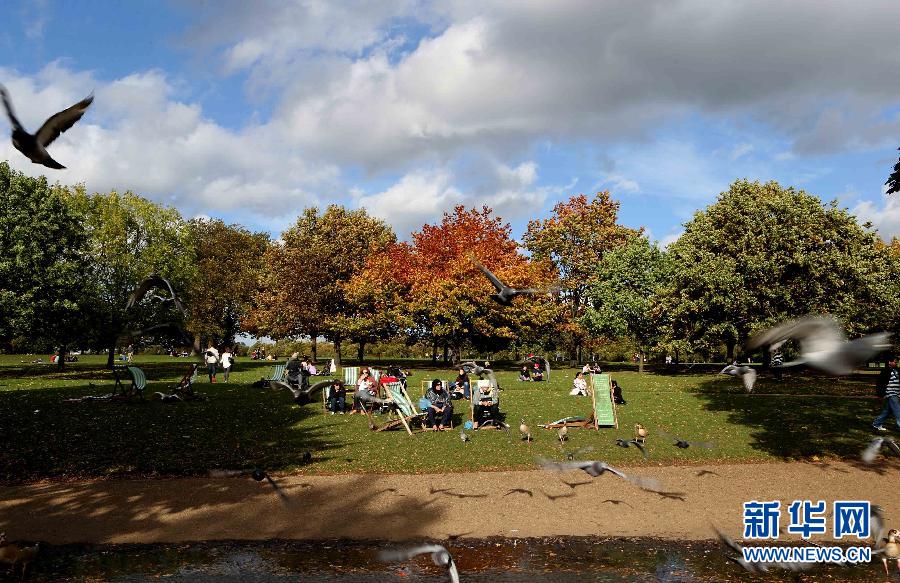 10月19日,在英国伦敦,人们坐在公园的躺椅上晒太阳。连日的阴雨天气过后,周日的伦敦天气晴好,秋意渐浓。 新华社记者韩岩摄