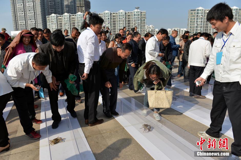 2014年10月18日,江苏洪泽县洪泽湖文化广场上正在举行螃蟹趣味运动会。当日,2014中国洪泽湖大闸蟹节——一名江名湖螃蟹趣味运动会在江苏洪泽县举行,来自全国各地的螃蟹养殖户用螃蟹参加了“螃蟹赛跑”、“螃蟹攀爬”、“螃蟹空翻”等项目的比赛。中新社发 陈亮 摄