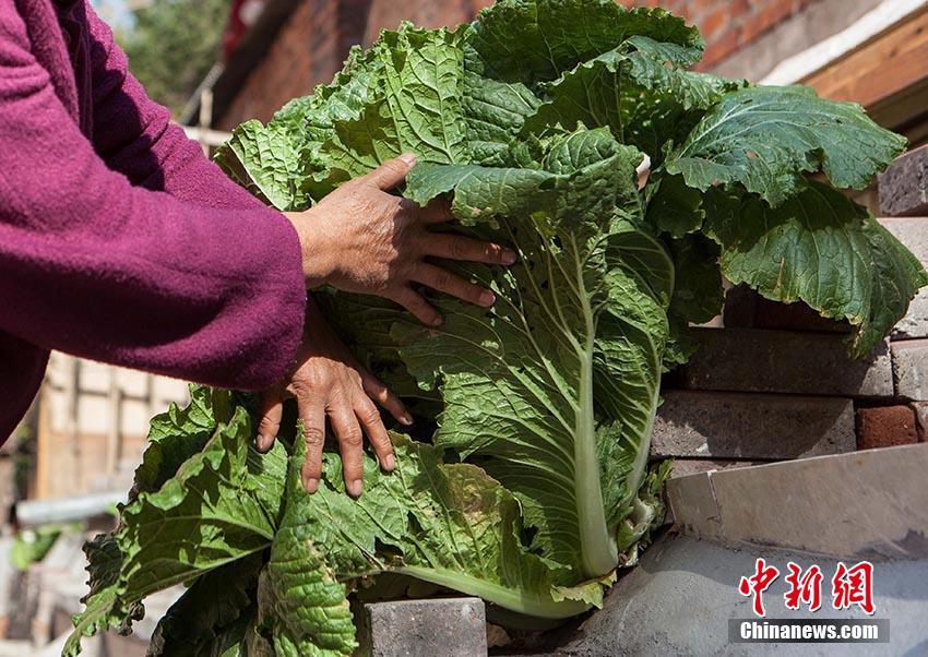 10月20日,长春市一小区内,居民正在查看一颗大白菜。8月中旬,有小区居民在菜池里种了一些白菜,一个月后,有一颗白菜从菜池的水泥缝里挤了出来,如今,这颗白菜越长越大,叶部直径已经超过了一米。 中新社发 蒋盛松 摄