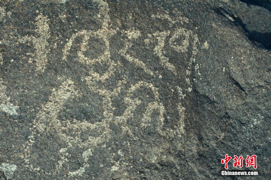 近日,新疆哈密黄田农场庙尔沟村发现疑似吐火罗语文字岩刻,岩刻与吐火罗语的文字笔画结构接近。吐火罗语和公元前1400年左右流行于小亚的语组的赫梯语关系尤为密切,可能是最古老的印欧语系的语言之一,也是大月氏人使用过的文字之一。图为哈密庙尔沟疑似吐火罗语文字岩画。中新社发 彭兴礼 摄