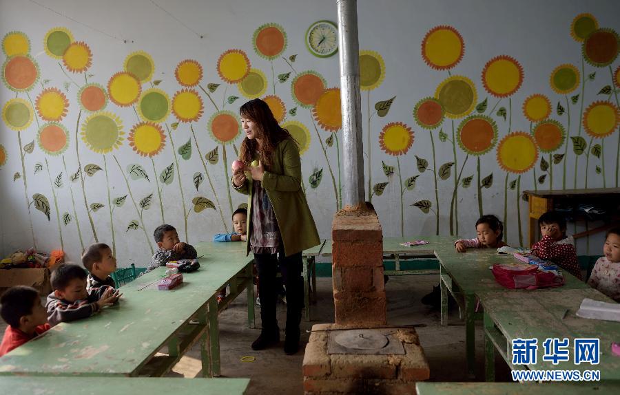 10月20日,王小静在给孩子们上课。王小静是河北省隆化县中关镇前中关村幼儿园唯一的一名教师,负责11个孩子。王老师说,她自己也是母亲,她把学生当成自己的孩子一样爱护。河北省隆化县有4万多名中小学生,其中不少学生家在偏远山区。隆化县为了让每一名学龄儿童不因为上学路途遥远而辍学,除加强中心学校的重点建设外,还因地制宜保留了79所“一人一校”乡村小学校或教学点,使偏僻山村的近1000名低年级小学生就近入学,有效地保证了全县学龄儿童百分之百的入学率。新华社记者金良快摄