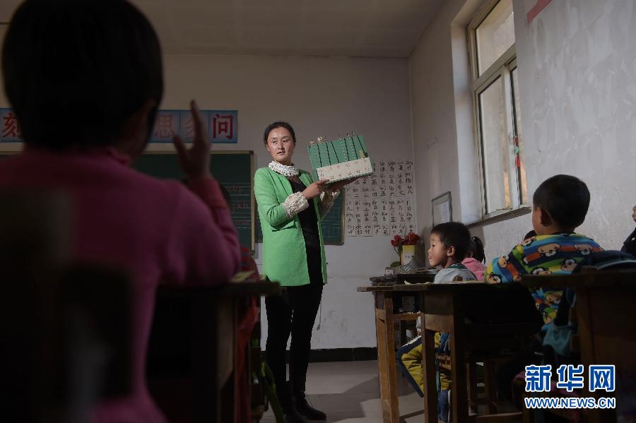 10月20日,钟丽娟在给孩子们上数学课。钟丽娟是河北省隆化县西阿超乡南山根村小学唯一一名教师,负责13个二年级和11个学前班学生。河北省隆化县有4万多名中小学生,其中不少学生家在偏远山区。隆化县为了让每一名学龄儿童不因为上学路途遥远而辍学,除加强中心学校的重点建设外,还因地制宜保留了79所“一人一校”乡村小学校或教学点,使偏僻山村的近1000名低年级小学生就近入学,有效地保证了全县学龄儿童百分之百的入学率。新华社记者金良快摄