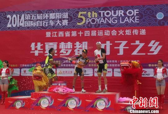 10月21日,2014第五届环鄱阳湖国际自行车大赛第九站在江西抚州举行,中华台北高士特职业车队选手萧世鑫再次夺得冠军。 王姣 摄