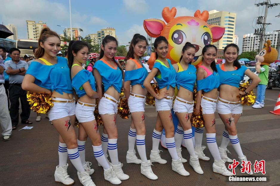 10月20日,2014年环海南岛国际公路自行车赛第一赛段澄迈绕城赛在海南省澄迈县开赛。在比赛前一群穿着靓丽的拉拉队宝贝随着动感音乐舞动身姿夺人眼球。 中新社发 骆云飞 摄