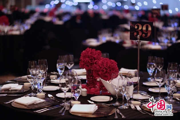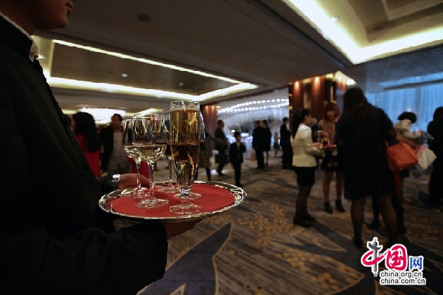 据悉,晚宴在酒店二楼1500多平的大宴会厅举行,此次到场来宾400多位,现场座无虚席。到场来宾先享用餐前鸡尾酒会,并在维也纳童声合唱团的背景墙前合影留念。6点40分,在主持人邀请下,来宾们开始享用由一流厨师团队打造的西式晚宴。