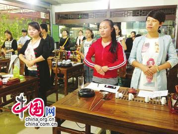 据御青茶艺学校负责人介绍,本届培训班是产区学员通过学习将产区丰富的茶及茶文化资源与齐鲁文化相融合,建立桥梁纽带关系,共同推动两地茶产业发展。学员可通过培训班系统了解专业茶文化知识,经考试获得相应职业技能资格证书。图为学员在学习茶艺礼仪。(伍策 作者:芦金亮 马艳德)