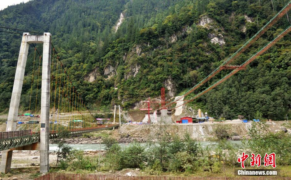 10月以来,川藏公路西藏林芝境内全长743米的双塔双索面混合梁通麦特大斜拉桥施工建设紧张进行中,预计2014年底建成。通麦特大斜拉桥建成后,川藏线“瓶颈”路段的通行难、危险系数高的现状将得到彻底改善,同时还将成为西藏境内一道横跨天堑、如虹飞涧的靓丽风景。图为川藏线“瓶颈”路段一座新大桥正在紧张施工建设中。 中新社发 刘忠俊 摄