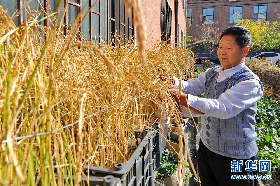 10月21日,焦玉海在查看水稻长势。时值金秋,长春市七旬老人焦玉海的“阳台稻田”即将收获。焦玉海介绍,从小生长在农村的他始终忘不了春种秋收的快乐,自退休后他就在阳台上种起各种作物,既能锻炼身体,又能吃到自己的劳动果实。2014年开始,他尝试用废旧箱子、塑料布种植水稻,十五只箱子可以收获水稻30余斤。新华社记者 张楠 摄