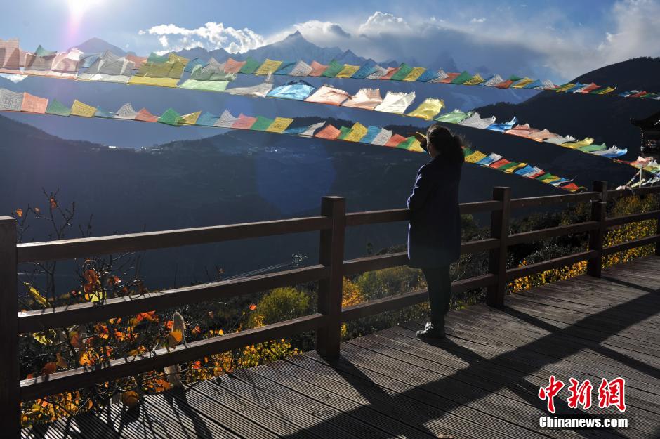 10月20日,云南迪庆州德钦县,在经幡掩映下的梅里雪山主峰卡瓦格博。梅里雪山位于云南省迪庆藏族自治州德钦县,平均海拔在6000m以上,主峰卡瓦格博海拔高达6740m,是云南的第一高峰。 中新社发 任东 摄