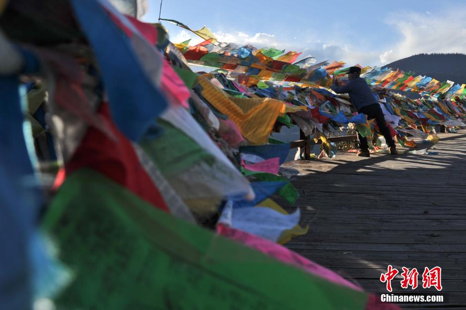 10月20日,云南迪庆州德钦县,在经幡掩映下的梅里雪山主峰卡瓦格博。梅里雪山位于云南省迪庆藏族自治州德钦县,平均海拔在6000m以上,主峰卡瓦格博海拔高达6740m,是云南的第一高峰。 中新社发 任东 摄