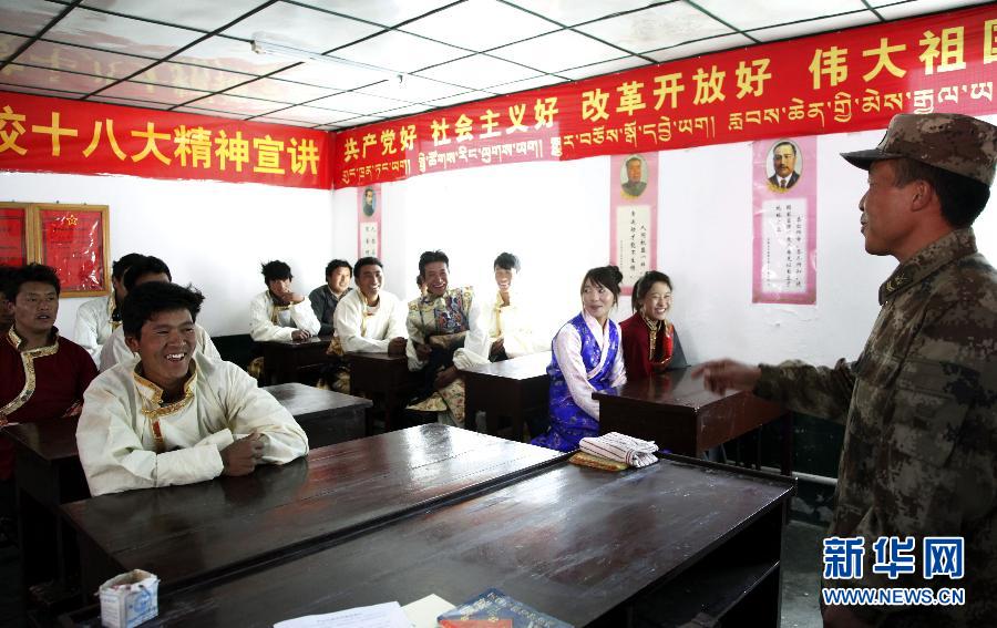 10月20日,川藏兵站部中坝兵站教员在军民共建光明夜校内给藏族农牧民讲课。西藏波密县玉普乡中坝村过去村民文化水平低,生产及生活水平不高。自20世纪90年代初起,川藏兵站部中坝兵站的解放军官兵利用晚上休息时间教村民学习汉语,随后他们创建了中坝村光明夜校,讲解党的方针政策,传授卫生医疗常识和农业种植养殖技术,增进了藏汉民族的团结。新华社记者 潘旭 摄