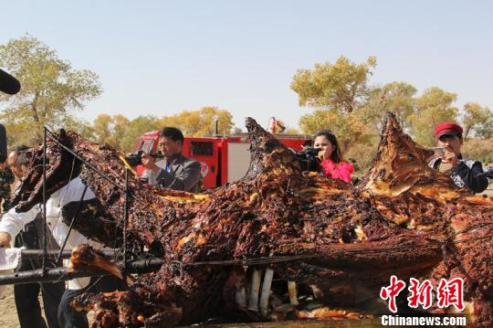 20日,新疆巴楚县第四代烧烤大师莫明?吾甫尔在该县国家4A景区红海湾胡杨公园用他特制的馕坑烤出一峰400公斤全驼。 朱景朝 摄