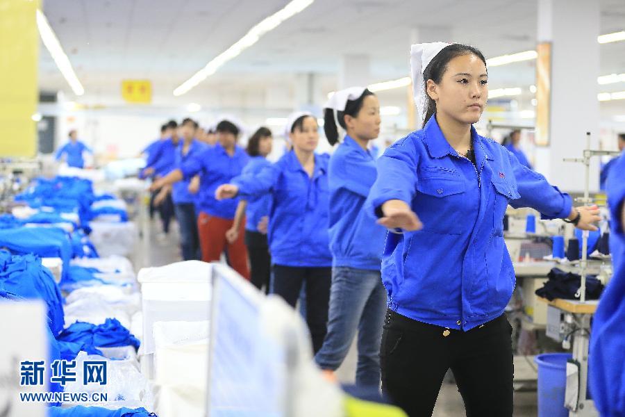 10月21日,山东青岛即发集团的女工在缝纫机台旁做工间操。