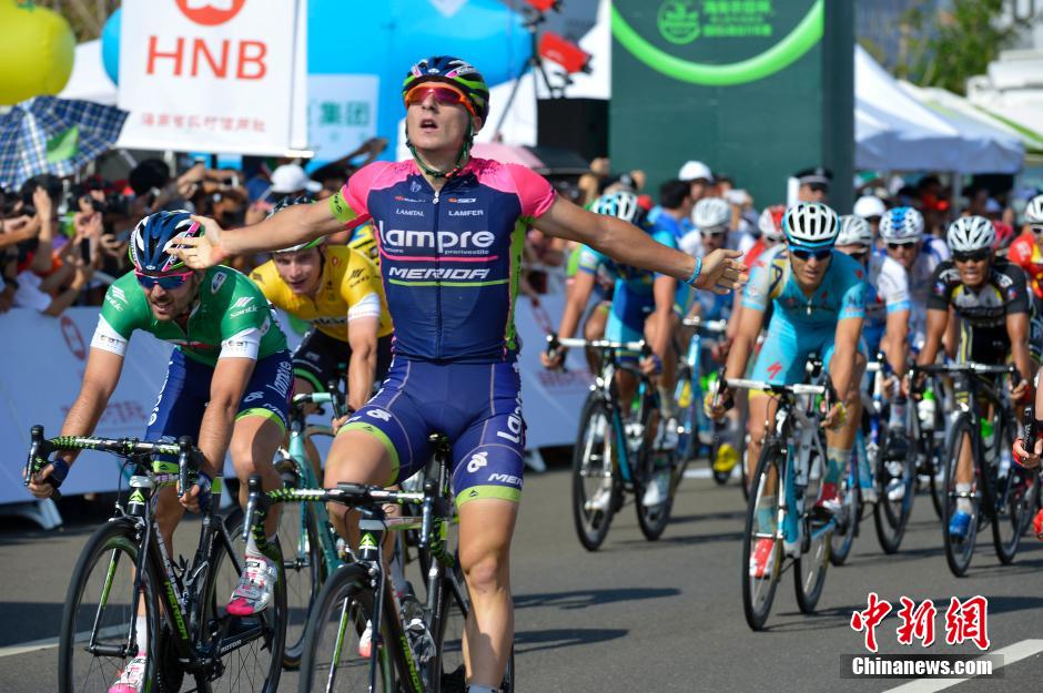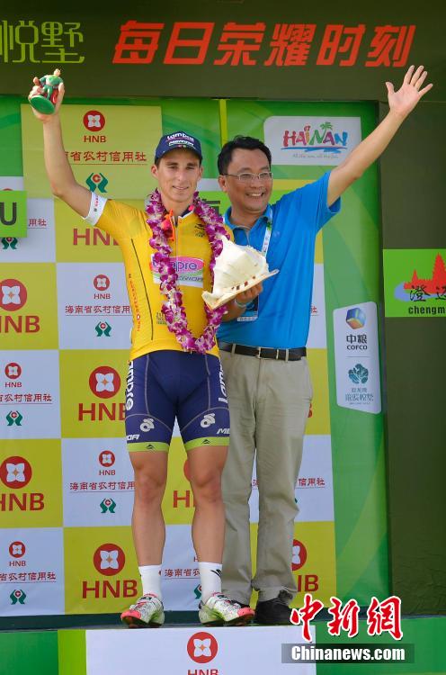 图为美利达-蓝波车队的意大利小将尼科洛·博尼法齐奥穿上代表总成绩第一的黄衫与颁奖嘉宾合影。中新社发 骆云飞 摄