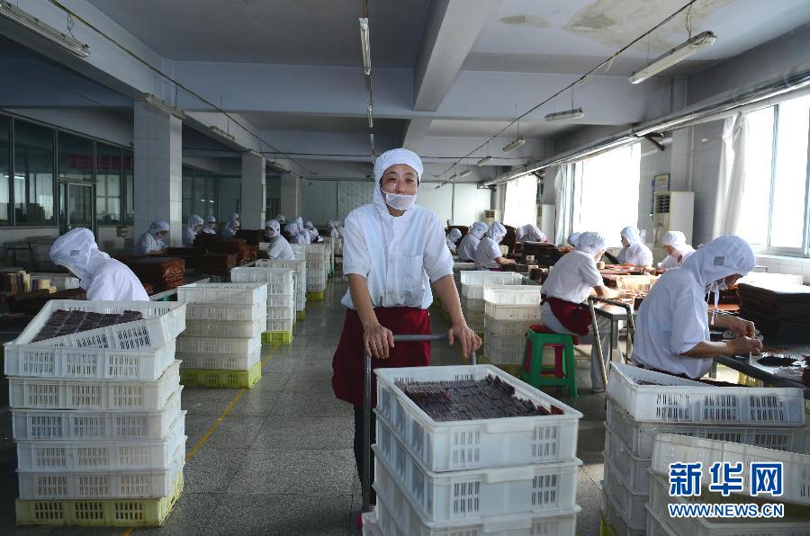 10月21日,河北省承德市怡达集团员工在制作山楂片。近年来,河北省承德市鹰手营子矿区大力发展山楂产业,不断延伸产业链条,培育多家山楂果品深加工企业。全区生产山楂休闲食品、罐头两大系列、200多个品种,年使用山楂9000余吨,年综合生产能力10万吨,产品远销美国等20多个国家和地区。新华社记者金良快摄