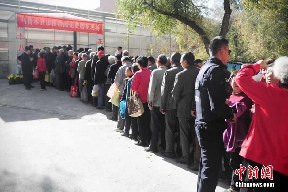 10月21日,乌鲁木齐市植物园免费向市民赠送菊花活动启动,活动共计13天。据介绍,参与赠送的菊花达23万盆,市场价300余万元,不乏名贵品种,所赠菊花都是“乌鲁木齐市植物园第18届菊花展”的参展花,赠花是为答谢市民18年来对菊花展的厚爱与支持。图为有名贵品种的展厅前,市民排队进入取花。马新龙 摄
