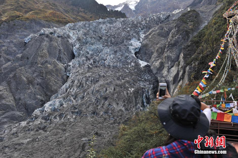 10月21日,游客观赏梅里雪山正在削减的冰川,当地民众称以前周围的岩石都被冰川覆盖。明永冰川位于梅里雪山群下,是云南省最大、最长和海拔最低的山谷冰川,山顶冰雪终年不化。据报道,目前明永冰川正在以每年50米左右的速度后退,主要原因在于全球气候变暖。中新社发 任东 摄