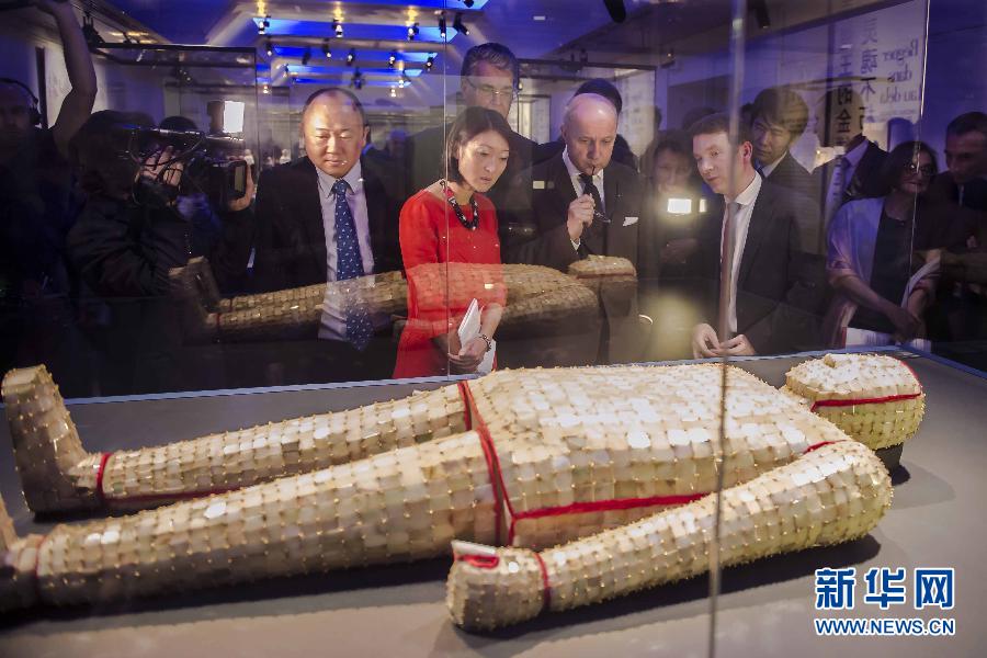 10月21日,在法国巴黎,法国外交部长法比尤斯(前排左四)与法国文化部长佩尔兰(前排左三)等参观文物展。当日,为纪念中法建交50周年,“汉风——中国汉代文物展”在巴黎吉美亚洲博物馆开幕。展览选取来自河北、河南、山东、江苏、湖南、陕西等27家文物单位的153组、459件展品。展览分为形韵之美、诸侯遗珍、农经为本等7大部分。新华社记者陈晓伟摄